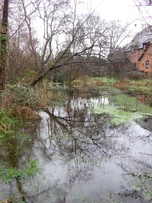 The pond is now full, thanks presumably to all the rain we've had recently, and more water coming in through the inflow pipe at the southern end, The outflow at the northern end will prevent the water level rising any higher, reassuring to the occupants of numbers 12 – 15 Cottage Mews right by the pond.