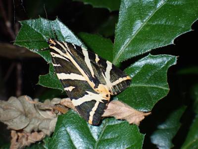 A brightly coloured moth flew past one of our members, showing dark wings with cream markings on the forewings and red on the hindwings, so we suspected it to be a Scarlet Tiger moth (Callimorpha dominula). These have been common in the Fordingbridge area and other places on the Hampshire Avon since at least the early 1970's, and have recently become much more widespread in southern Britain. The moth came to rest on holly underneath a hazel bush, and to our surprise turned out to be the closely related and similarly coloured Jersey Tiger moth (Euplagia quadripunctaria).